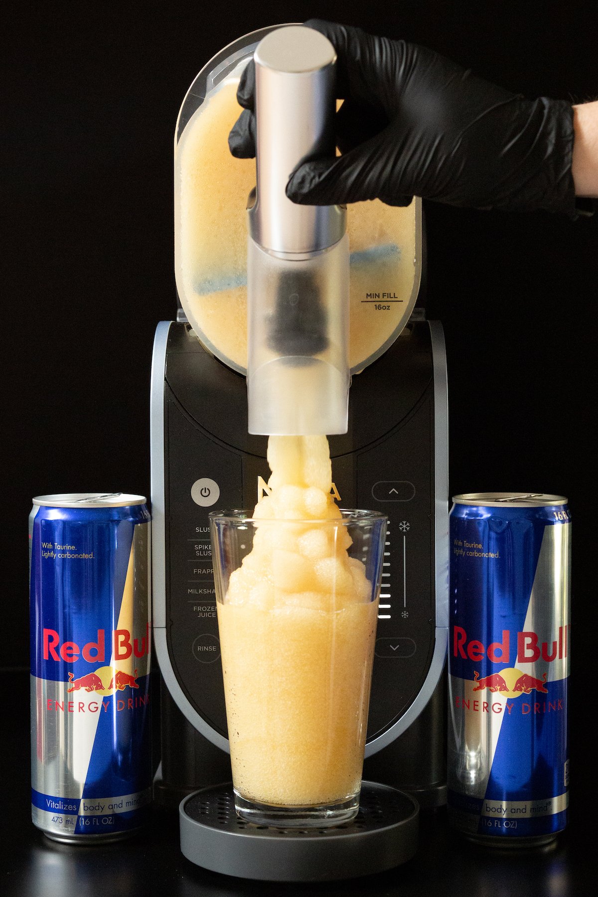 - Want to make it in a blender instead? Add 16 oz Red Bull and one cup of ice to a high-powered blender. Blend at a high-speed until desired consistency is achieved.